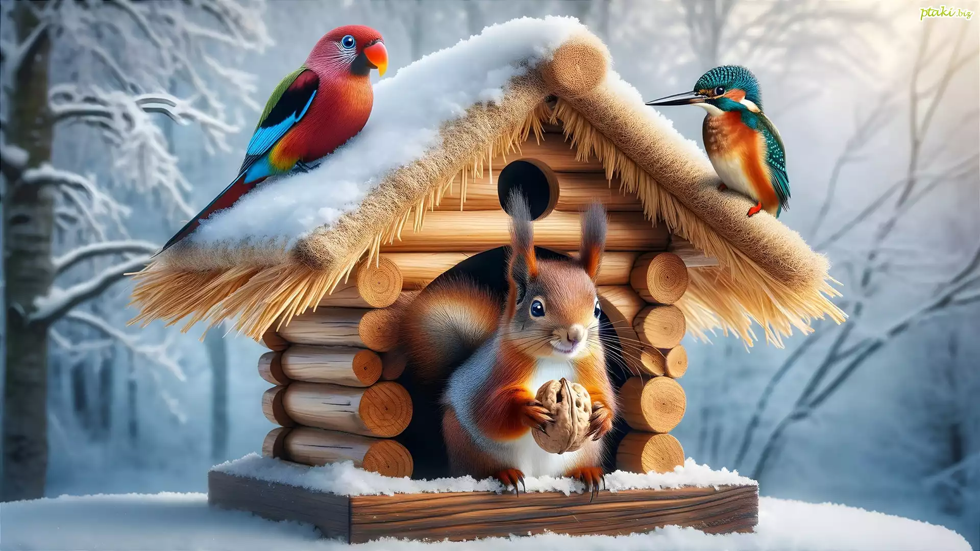 Wiewiórka, Ptaki, Papuga, Zimorodek, Karmnik, Zima, Grafika