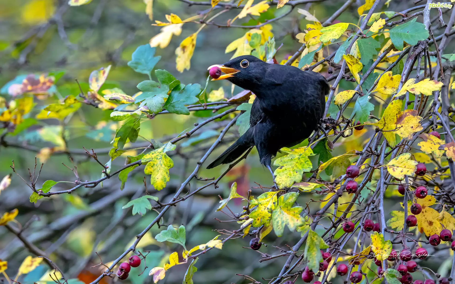 Czarny, Ptak, Kos, Żółte, Liście, Gałęzie, Jagody