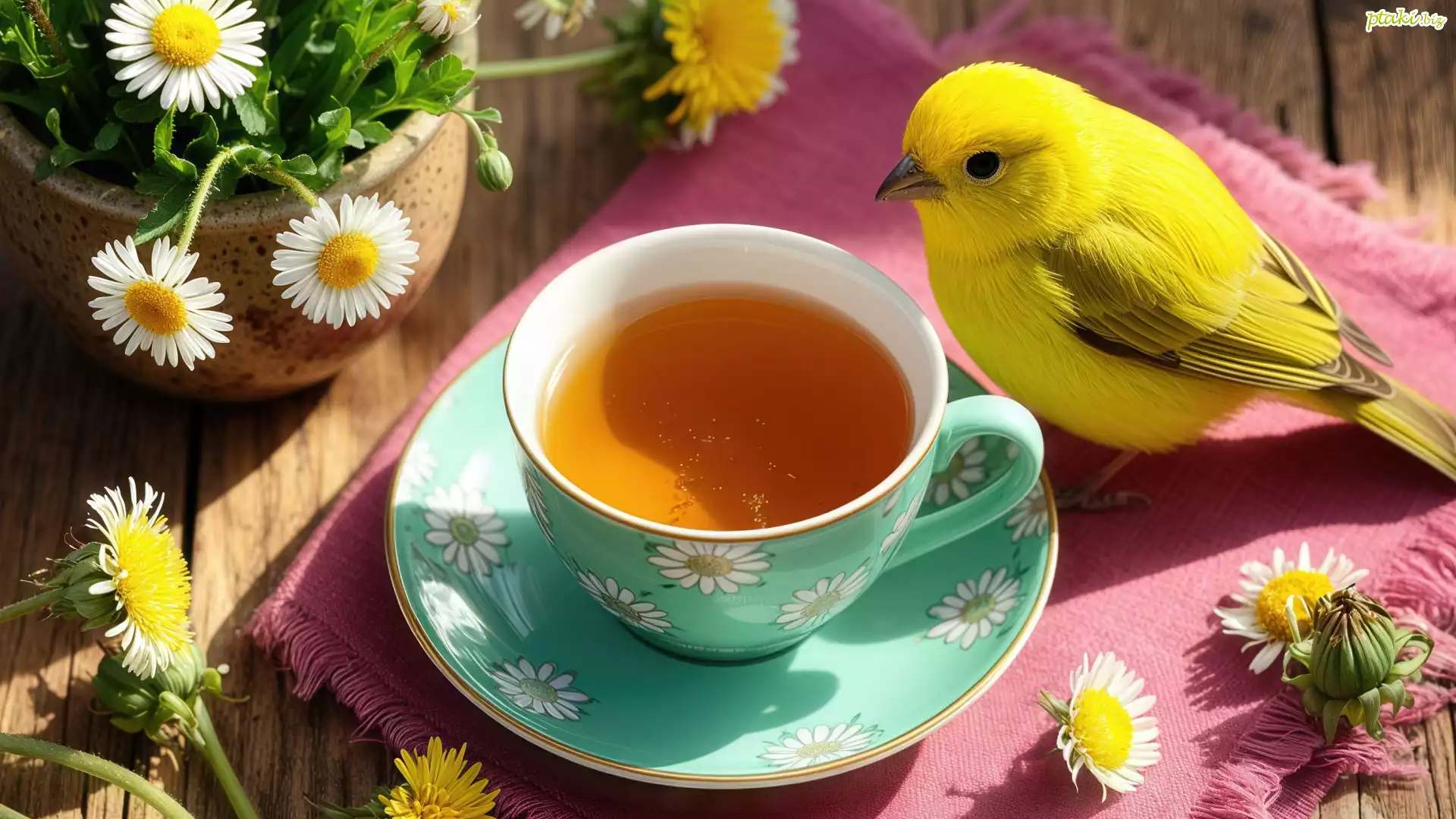 Filiżanka, Herbata, Kwiaty, Żółty, Ptak, Kanarek