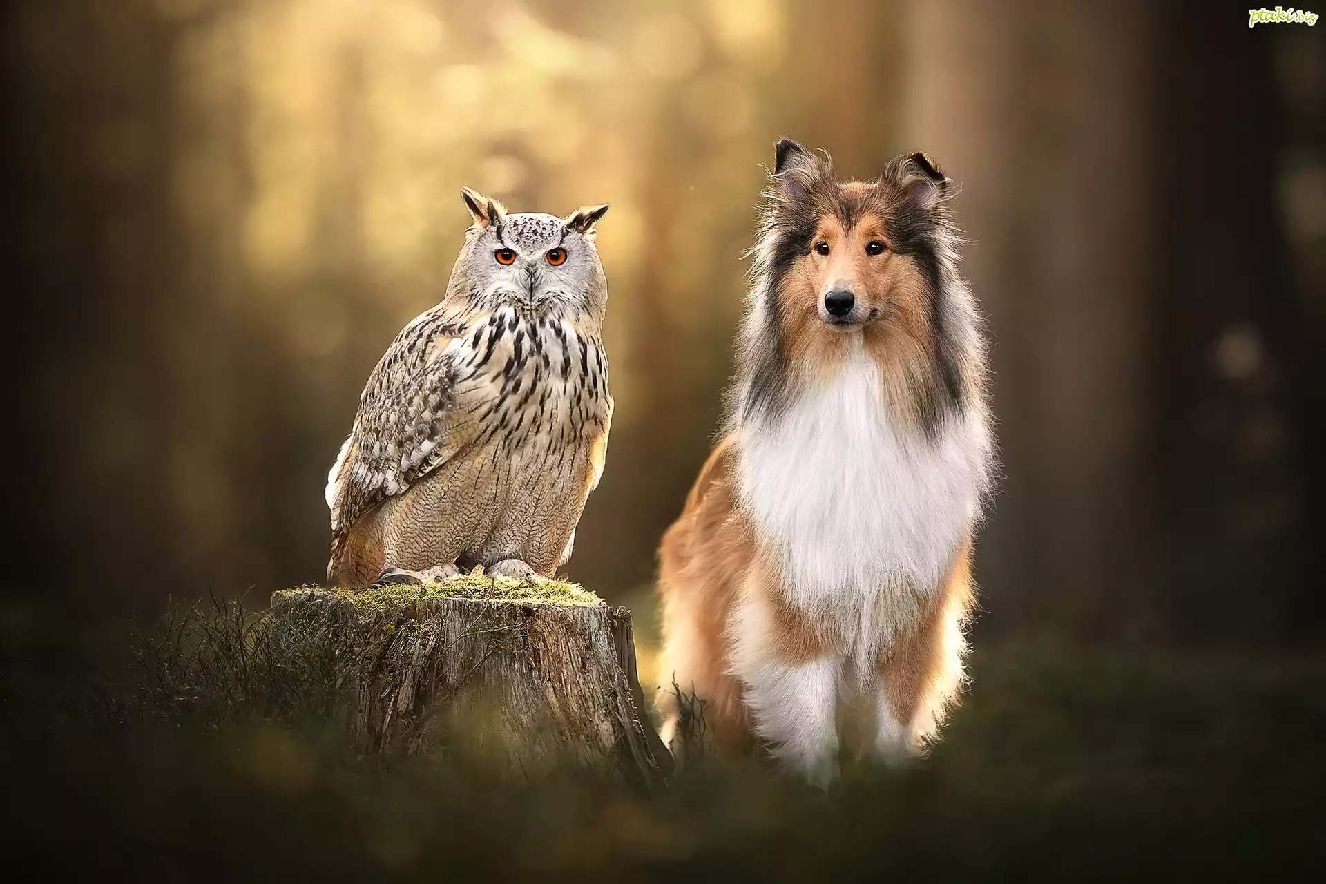 Sowa, Uszatka zwyczajna, Owczarek szkocki, Pień drzewa, Pies, Ptak, Sowa Uszata